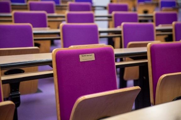 Inscrivez votre nom, prénom et promotion, ou celui d’une personne marquante (camarade de promo, membre du personnel, etc.), sur le dossier d’un siège d’amphithéâtre.